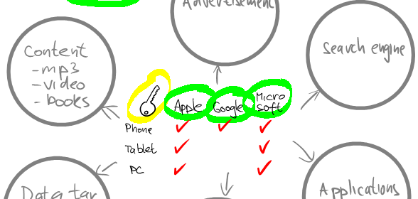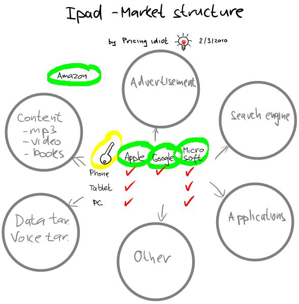 Fakt, že cena základní verze Ipadu je relativně nízká, má svůj význam. Ipad je totiž něco jako KLÍČ (hardware) k branám dalších odvětví např. muzika, video (content), aplikace (software) apod. Tahle odvětví budou nebo už mají několikanásobně větší ziskový potenciál než samotný přistroj. Apple tohle ví, takže základní cenu Ipadu posunul hodně nízko. Na tomto obrovském trhu se pohybyjí tři hlavní hráči Apple, Google a Microsoft. Apple a Microsoft už mají jak PC, telefony i tablety. Google má zatím jen telefon. No a pak se tam pohybují další “menší” hráči např. Amazon a jeho “babička” Kindle. Každý z těchto hráčů ví, že čím více klíčů prodá, tím v budoucnu budou vyšší zisky.