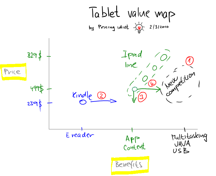 Zákazník zvažuje u každého produktu dva faktory, BENEFITY = co mu produkt přináší a CENU = co za to zaplatí. Na hodnotové mapě dole (vysvětlení zde) pak vypadá současná situace následovně. Skupinu elektronických čteček představuje Kindle, je nejlevnější, ale také toho umí nejméně, pak se na trhu objeví Ipad, umí toho více a je dražší. Co bude následovat?