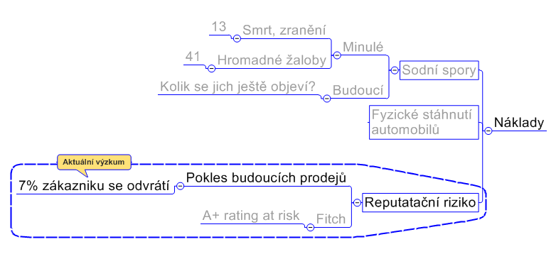 Kolik to bude všechno stát, záleží hlavně na rychlosti s jakou se firma vypořádá s problémem. Na obrázku je vidět struktura nákladů na řešení problémů. Nejdůležitější bude napravit ztrátu důvěry zákazníků (výzkum ukázal, že 7% rozhodnutých zákazníků pro Toyotu změnilo svůj názor), která ovlivní prodeje v budoucích letech. Soudní spory (čísla představují současný počet žalob) a fyzické opravy se dají vyřešit poměrně „jednoduše a levně“. Viděl jsem aktuální odhady na řešení pro rok 2011 v rozmezí 2-5 miliard USD. Toyotu to nepoloží, má roční výnosy zhruba 200 miliard USD, každopádně to srazí významně celkový zisk. Skutečný dopad (včetně zničeného brandu) bude o řád vyšší a to v desítkách miliard dolarů…