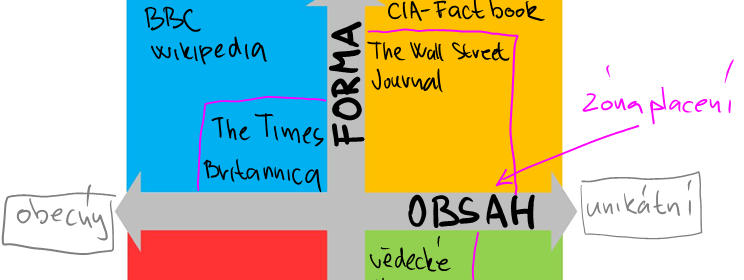 Pokusím se to vysvětlit na následujícím obrázku. Dvě osy rozdělují informace na čtyři skupiny. Dle OBSAHU na obecné vs. unikátní. Dle FORMY na nestrukturované vs. strukturované (dostupné, jednoduché a pochopitelné). HODNOTA informace roste s unikátností OBSAHU a dostupností, pochopitelností a jednoduchostí FORMY. To jestli bude fungovat placený model, ale ještě závisí na faktu, zda není stejná informace (stejný obsah i forma) dostupná ZDARMA. Pokud tomu tak není, pak se může informace nacházet v tzv. placené zóně (fialová čára). Nejlépe to vysvětlím na příkladech.