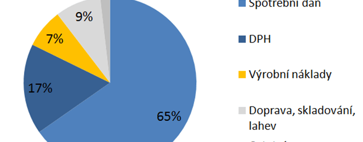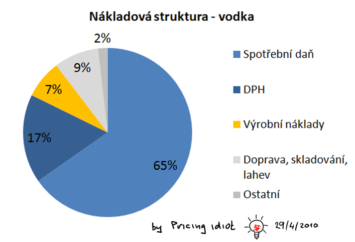Celou logiku budu demonstrovat na příkladu levné půllitrové lahve vodky za zhruba 120 Kč. Když jsem nedávno viděl rozpad nákladů na jednotlivé položky, tak jsem byl docela překvapen (viz. obrázek). Z celkových nákladů 80 Kč tvoří přes 80% daně a pouze 7% představují výrobní náklady, zbylých 12% připadá na dopravu a lahev.