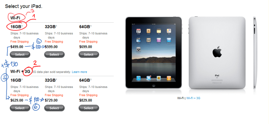 Tři parametry definují celkem 8 výrobků v produktové řadě s cenou v rozmezí od 499 USD do 829 USD. V téhle škále si může vybrat skoro každý. Chtěl bych zdůraznit, že cenové rozdíly mezi jednotlivými variantami nemají nic společného s rozdílnými náklady na výrobu. Např. 3G modul stojí pár dolarů. Profitabilita vyšších verzí tedy stoupá. Cena je odvozena od toho, jak si cení zákazník jednotlivé charakteristiky. Dalším zajímavým faktem, je že Apple si za 3G modul, nechá zaplatit 130 USD. Kindle od Amazonu pouze 50 USD. To je dáno dvěma fakty: