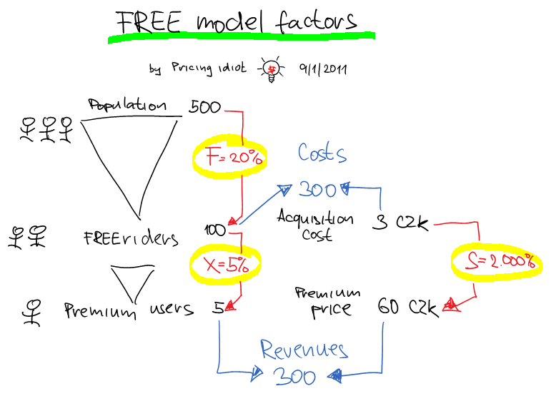 Na obrázku je ukázka modelu, který dosahuje bodu zvratu (náklady = výnosy = 300 CZK) při hodnotách faktorů F=20%, X=5%, S=2.000%. Pokud by měl být ziskový, je třeba zvýšit buď X factor (např. premium verze musí být atraktivnější, nebo přechod na premium je povinný jako u „30 days trial“) nebo S faktor (zvýšit cenu, snížit náklady). Tenhle koncept se dá uplatnit na všechny čtyři výše uvedené modely.