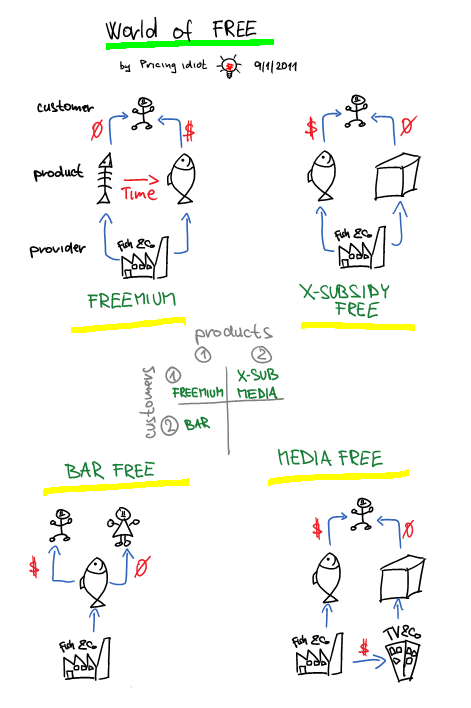 Tenhle model není výhradně spojen s médii, zákazník dostává ZDARMA obsah, za obsah zaplatí výrobce zboží, který zadává do média reklamu. Zákazník koupí zboží, skrytě platí za obsah médií. Dalším častým příkladem, bývá situace, kdy tenhle model dotuje subjekt, který sbírá data o zákaznících a ty pak využívá dále např. Google.