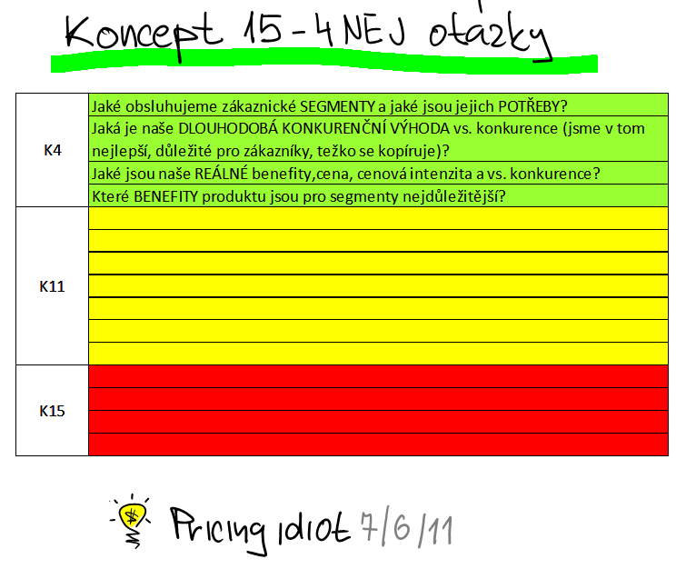 Minule jste měli šanci vidět K15 – patnáct nejdůležitějších pricingových otázek. Dnes uvidíte část výsledků dotazníku, na který odpovědělo přes 300 respondentů. V rámci dotazníku jste mohli seřadit otázky dle důležitosti. Výsledekem jsou 3 zóny od nejdůležitější ZELENÁ, ŽLUTÁ a ČERVENÁ. Zde jsou první čtyři otázky K4 ze zelené zóny. Pokud chcete vidět kompletní výsledky = seřazených všech 15 otázek, máte možnost stát se členy PIG, kde jsem výsledky již dnes zveřejnil.