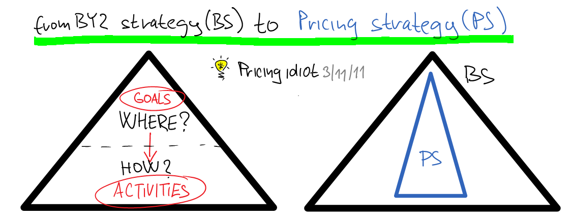 Tohle platí i o byznys strategii (BS). Začal jsem záměrně byznys strategií, protože to je nejdůležitější koncepce ve firmě. Pricingová strategie (PS) je také PLÁN se stejnou strukturou KAM a JAK. PS MUSÍ podporovat a být součástí BS. CÍLE a AKTIVITY PS jsou části, z kterých je postavena BS. Proto je PS vyobrazena jako menší pyramida, která je součástí větší tedy BS.