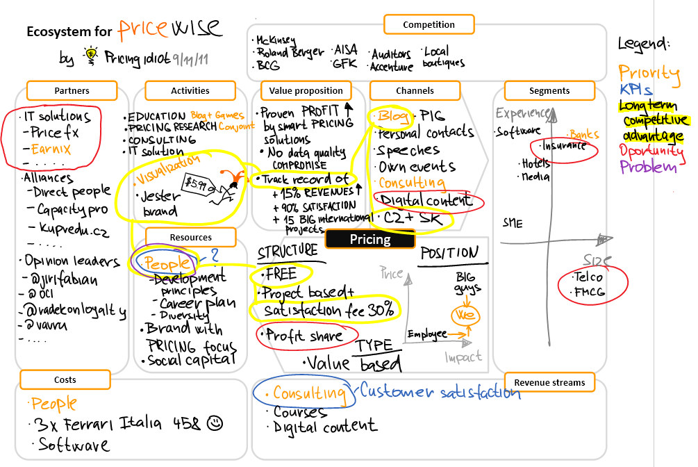 Dneska jsem hodně kreslil a tak se s vámi podělím. Vysvětlím vám, co chápu pod pojmem Ekosystém byznysu a proč ho používat. Já rozumím ekosystému jako ucelenému pohledu na různé KOMPONENTY byznysu. Předem podotýkám, že jsem se nechal inspirovat touhle parádní knížkou a konceptem Business model canvas, postupně jsem si Ekosystém upravoval pro Pricingové potřeby.