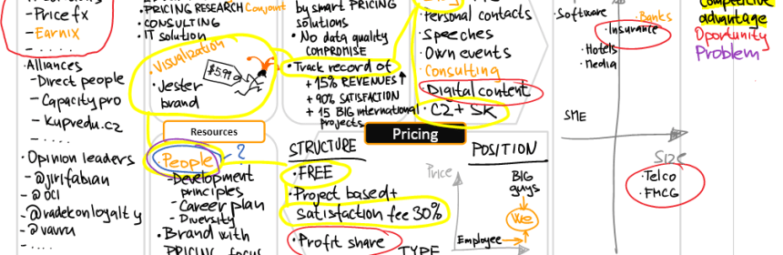 - Pricing – pricingová strategie jak nastavovat cenu a za kolik. Více zde (PW: Jsme stejně dobří jako nadnárodní konzultanti, ale levnější – nemáme známý brand, cena obsahuje variabilní složku spokojenosti)