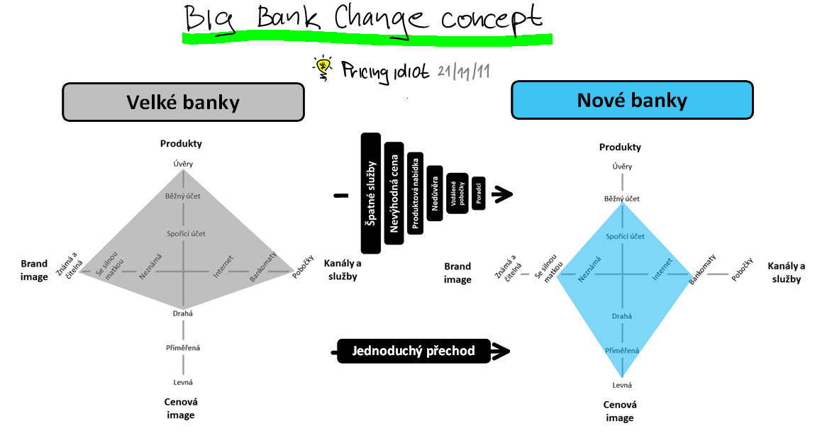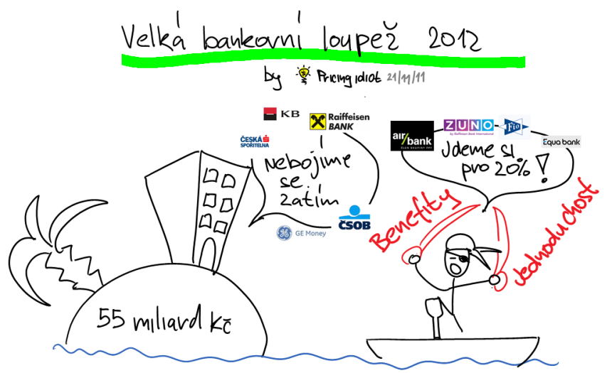 myslím si, že u bank k cenové válce nedojde, jednak proto, že jsou si vědomy následných ztrát (jak psal PricingIdiot) a druhak proto, že jsou BB /big banks/ ve stavu značné komoditizace, což dává těm malým obrovský prostor pro obranu vůči ní – např. Zuno a AirBanka dávájí najevo, že budou intenzivně pracovat na vztazích se zákazníky a servisu (kvalita, přístup, lidskost), mBanka a LBBW se snaží utrhnout cenově citlivou poptávku a lidi, kteří chtějí banku s low-costs a snadnou dostupností online, na fyzické dostupnosti jim až tolik nezáleží. Problémy budou LC právě s vyrovnaností poplatků a úrokových marží, protože LC na tuzemské poptávce nebudou schopné žít na depozitech (lákají vysokým úrokem), tím pádem nebudou moct příliš půjčit (se středním/vyšším úrokem) a do operací na volném trhu nepůjdou podle mě kvůli vyššímu riziku při jejich nízké kapitalizaci. Tím pádem osekají náklady na minimum a zjistí, že se nevyhnout nabídnutí něčeho navíc, co zákazníky osloví, jim přinese minimum nákladů a vyšší výnosy a jiné banky to budou moct jen stěží kopírovat.