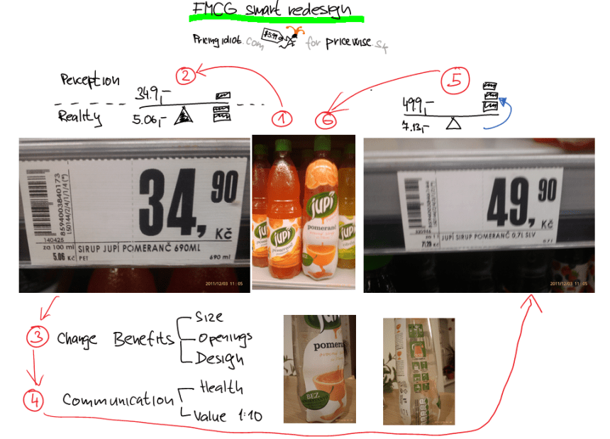 „Je krize a obchodní řetězce nás nutí do snižování cen“, plakají výrobci spotřebního zboží. Lépe řečeno plakají ti hloupější výrobci. Ti chytřejší inovují chytře (důležité je slovo chytře). Tady je jeden konkrétní příklad. Chodím pravidelně nakupovat potraviny pro celou naši rodinu. Ovocná šťáva v plastovém obalu patří mezi naše základní potraviny. Jupí je moje oblíbená značka, protože mi chutná. No a když jsem naposledy sáhnul opět do stejného regálu, zarazil jsem se. Uviděl jsem dvě podobné šťávy. To nedává smysl! Ale dává. Je to chytrý příklad inovace – zvyšování hodnoty produktu spolu se zvyšováním ceny. Jedna ze základních strategií jak se chovat v recesi. Tahle inovace je o to zajímavější, že původní výrobek zůstává (ochutnal jsem obě šťávy a nepoznal rozdíl) a mění se jen obal.