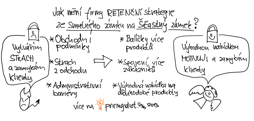 Popíšu Vám jedno možné řešení, které zlepšuje retenci zákazníků resp., jak se mění retenční strategie firem. Dříve se firmy snažily zabránit zákazníkům v odchodu, pomocí administrativních bariér – složitých podmínek pro odchod a zamykaly klienta nedobrovolně. Vytvářely Nešťastný zámek. Chytré firmy se snaží dnes udržet klienty pozitivní motivací, tak že vytváří struktury produktů, které jsou pro zákazníka atraktivní a ti se dobrovolně zamykají jejich využíváním proto Šťastný zámek.