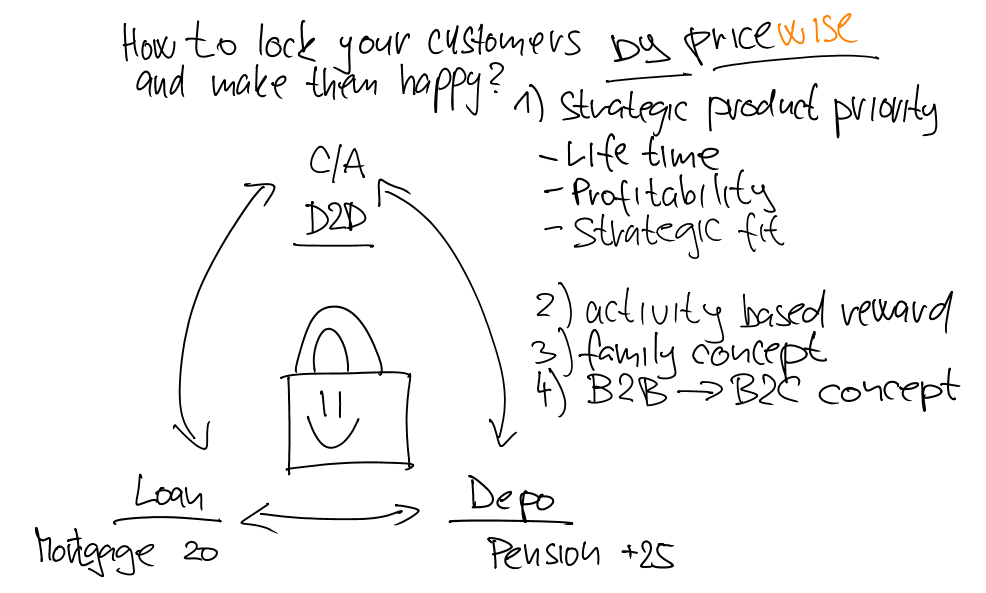 Pokusím se popsat Šťastný zámek na bankovních produktech viz. obrázek, stejně tak to bude fungovat i v jiných odvětvích. Každá banka nabízí v zásadě 3 typy produktů Day to day banking – běžný účet (C/A), Depozita a Úvěry. Pokud chce klienta zamknout na nejdelší dobu, musí propojit produkty s nejdelší životností, tak že vytvoří balíček těchto produktů a např. za využívání běžného účtu sníží klientovi sazbu na hypotéce nebo bude posílat odměny na penzijní připojištění.