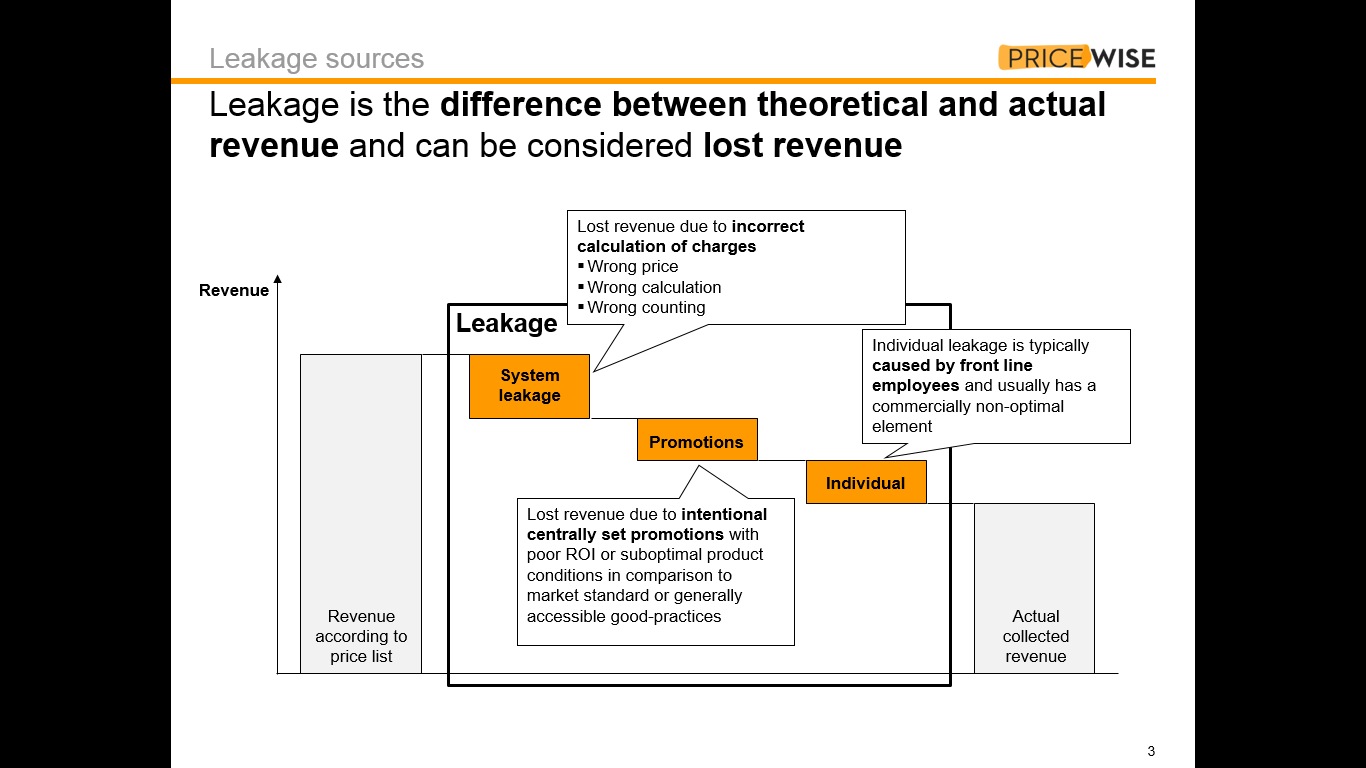 - Individuální – vznikají všude, kde je v průběhu prodejního procesu člověk a jeho individuální rozhodnutí. Za leakage lze např. považovat nevhodně použitou slevu nebo neoprávněně použitou slevu. Řešením je kvantifikace slev poskytnutá v porovnání s velikostí transakce přes jednotlivé produkty, prodejce, pobočky, regiony a kanály apod.