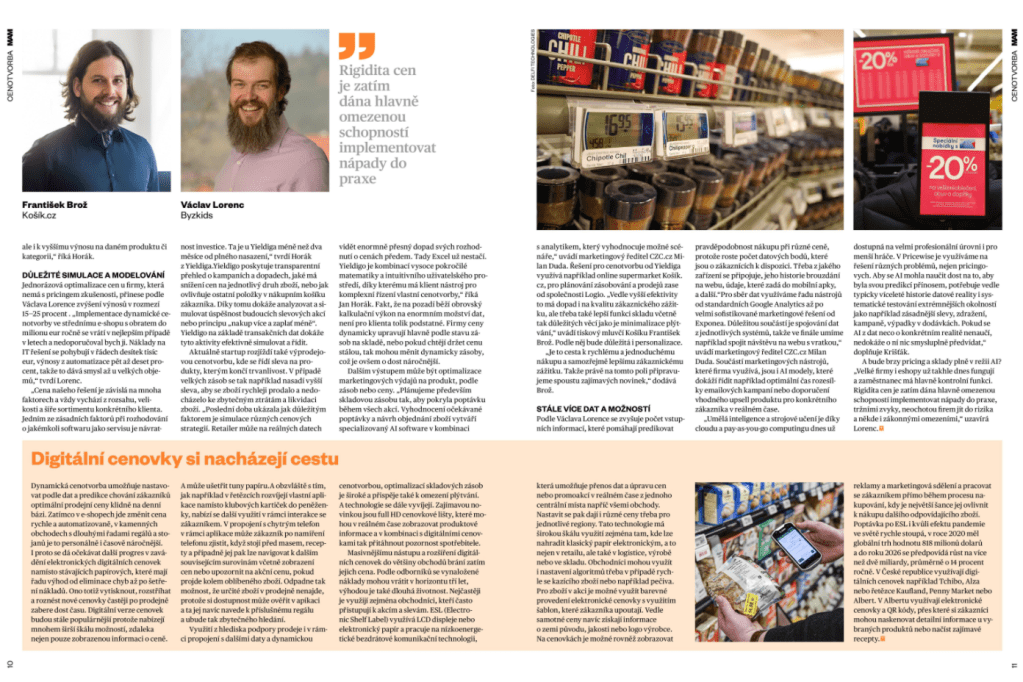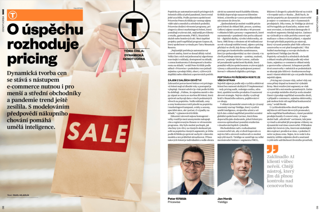 - Pokud AI = automatizace, tak ano. Základní analýzy jsou již 10 let stejné jen se mění podíl automatizace, tzn. analýzy se dělají a propisují do cen bez zásahu zaměstnance. Dále se zvyšuje počet vstupních informací, které pomáhají predikovat pravděpodobnost nákupu při různé ceně, protože roste počet datových bodů, které jsou o zákaznících k dispozici – např. z jakého zařízení se připojuje, jeho historie brouzdání na webu, údaje, které zadá do mobilní apky apod.
