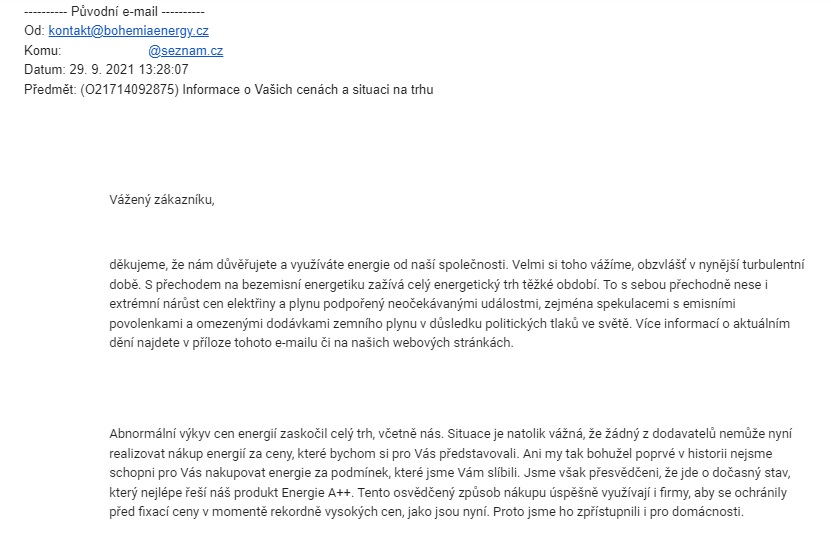 Příklad 1) Aktuálně poskytovatel informuje o zdražení energií a vypovězení smluv. Je to složité a nedůvěryhodné.