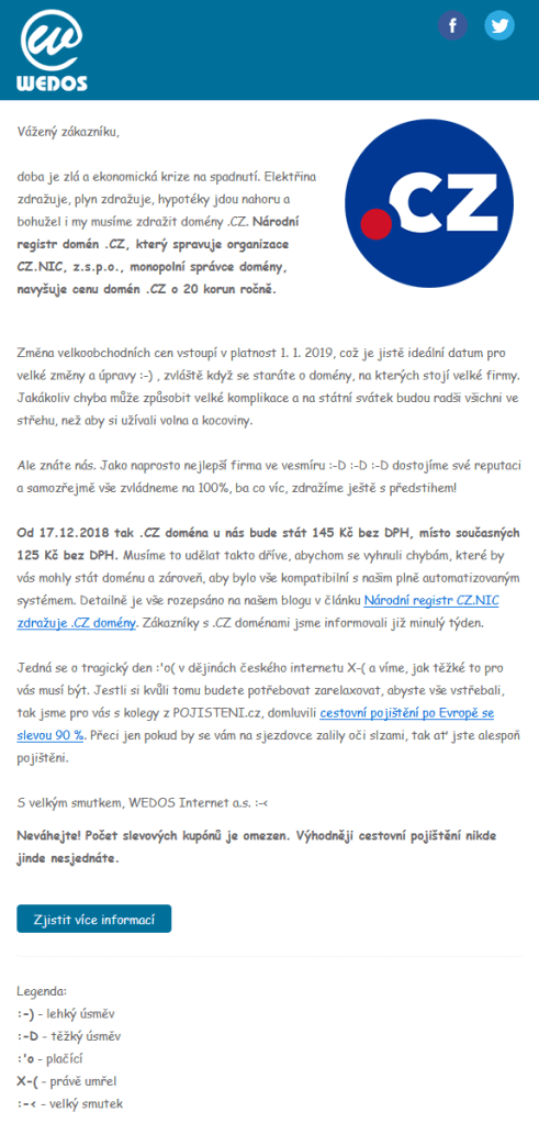 Příklad 2) Registrátor domén oznamuje zvýšení cen. Bohužel si splet disciplínu a nasadil rádoby vtipný tón a navíc vyžívá situace k prodeji produktů 3. strany.